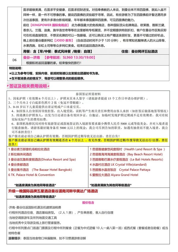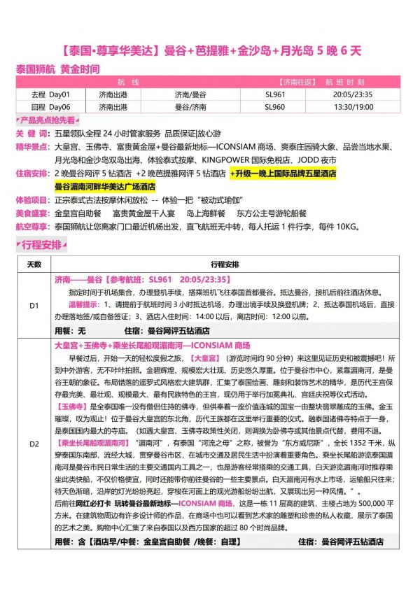 泰國6天5夜游 聊城出發(fā) 純玩 無購物 曼谷 芭提雅 珊瑚島 金沙島 ...... 發(fā)團時間 20230609 20230612 價格 2980 報名電話 0635 8681234