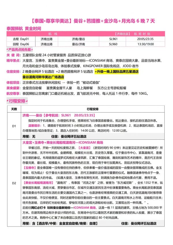 泰國7天6夜游 聊城出發(fā) 純玩 無購物 曼谷 芭堤雅 珊瑚島 金沙島 ...... 出團(tuán)日期 20230610 價格 3180 報名電話 0635 8681234