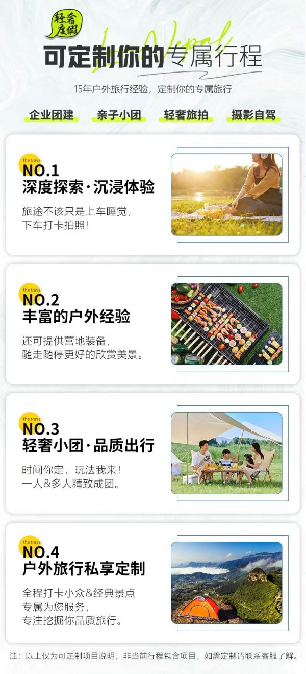 私人訂制:我們業(yè)務(wù)范圍囊括了全國(guó)各大城市,川西、西北、西藏、新疆,在路上永遠(yuǎn)有我們的身影。我們將為每一個(gè)有定制需求的你策劃出獨(dú)屬于自己的完美旅行。