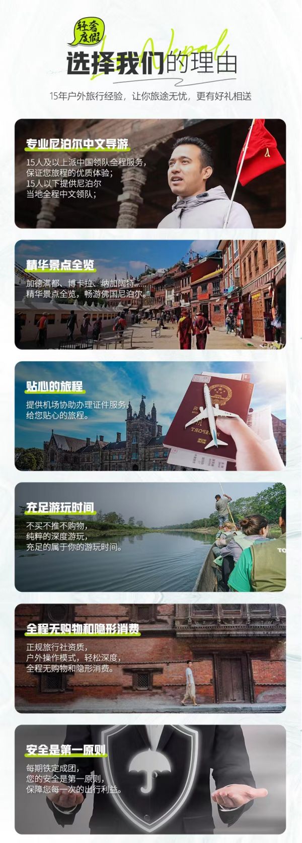 4.導(dǎo)游服務(wù):15人及以上派中國(guó)領(lǐng)隊(duì)全程服務(wù),保證您旅程的優(yōu)質(zhì)體驗(yàn);15人以下提供尼泊爾當(dāng)?shù)厝讨形念I(lǐng)隊(duì)(成都機(jī)場(chǎng)有送機(jī)人員協(xié)助辦理登機(jī)牌、出發(fā)手續(xù))。