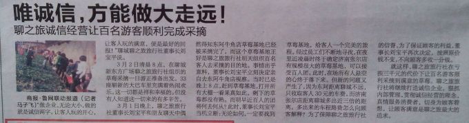 3月1日晚上,聊之旅旅行社董事長(zhǎng)劉寶平和朋友聊天中偶然得知東阿牛角店草莓基地已經(jīng)被采摘完了,而這個(gè)草莓基地正好是聊之旅旅行社明天組織百名客人去采摘的目的地。事情出乎意料,董事長(zhǎng)劉寶平當(dāng)即立刻決定親自去東阿牛角店視察。當(dāng)時(shí)已是晚上8點(diǎn),趕到草莓基地,打開(kāi)所有大棚一看果真如此,剩下的草莓都沒(méi)有熟。而明早近百人的團(tuán)將何去何從?此時(shí)此刻,董事長(zhǎng)劉寶平當(dāng)機(jī)立斷:無(wú)論如何,一定要找到草莓基地,給客人一個(gè)完美的旅程。經(jīng)過(guò)員工們不斷地尋找,在夜里近凌晨時(shí)終于確定濟(jì)南張爾店有規(guī)模很大的草莓基地,可以接受百人團(tuán)。此時(shí),在場(chǎng)所有人懸空的心終于落下來(lái)。但新的問(wèn)題又產(chǎn)生了,因?yàn)闁|阿距離聊城不遠(yuǎn),只收取客人30元的車(chē)費(fèi)。而濟(jì)南張爾店距離聊城多出近三倍的距離,多出來(lái)的車(chē)程路費(fèi)怎么向顧客解釋?zhuān)繛榱吮U狭闹寐眯猩绲男抛u(yù),為了保證顧客的利益,董事長(zhǎng)劉寶平再次決定,按照原價(jià)錢(qián)不變,不向顧客多收一分錢(qián)。
