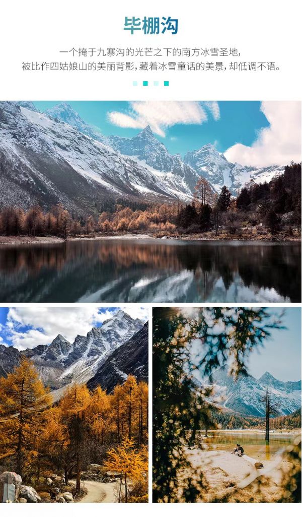 有“四姑娘山后花園”美譽的畢棚溝(不含景區(qū)觀光車60元/人-上行游客中心-龍王海/下行娜姆湖酒店-游客中心),溝內(nèi)有原始森林、絢麗多彩的植被、雪山溫泉,景觀豐富,一年四季各有各的美。初春時節(jié)斑駁著枯色的山林正漸漸蘇醒,枝丫生出新的綠色希望,溪流才開始解凍,半冰半水潺潺流動,垂卷而下的百米瀑布如白砂裹雪;夏季,那些綠的希望已匯成一片汪洋,瀑布喧鬧得歡騰而下,踱步原始森林中蜒曲的小道,遠眺藍天高山,奇特的萬年冰川,感受城市中沒有的舒爽;