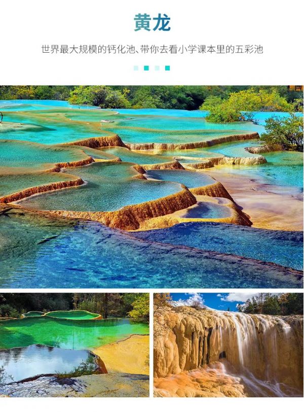 【黃龍風(fēng)景區(qū)】因其獨特的景觀、原始的生態(tài)和豐富的資源被美稱為“人間瑤池”,在這里我們可以親身體驗到“彩池、灘流、雪山、峽谷、古寺、民俗”六絕的獨特魅力。黃龍風(fēng)景區(qū)鈣化景觀非常壯觀,鈣化邊石壩彩池、鈣化灘、鈣化扇、鈣化湖、鈣化塌陷湖、坑,以及鈣化瀑布、鈣化洞穴、鈣化泉、鈣化臺、鈣化盆景等一應(yīng)俱全,是一座名副其實的天然鈣華博物館。乘坐索道后,我們繼續(xù)沿觀光道往景區(qū)最高點——五彩池、黃龍寺方向徒步,再順著游客道便能走出景區(qū);體力有限的游客也可以選擇不行返回索道口,自費乘坐索道離開景區(qū)。
