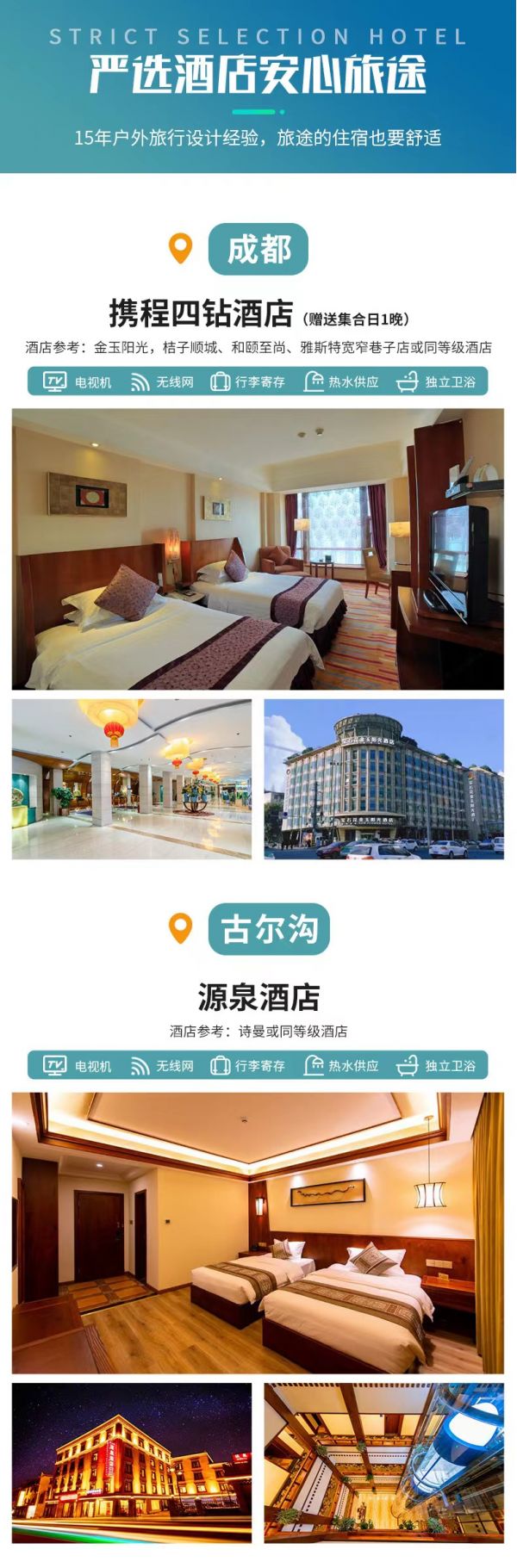 (2)如當(dāng)天實際情況不允許,則會調(diào)整入住于畢棚溝溫泉酒店,望您諒解。