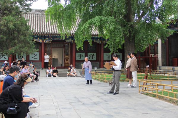 劇中,1937年七七事變前夕,為盡可能保留華北古建筑資料,梁思成、林徽因等對(duì)重要古建進(jìn)行搶救性測(cè)繪,在恭王府巧遇古建老匠人,自此展開了一段長(zhǎng)達(dá)20余年的知己相交之緣。在室外的第一幕表演結(jié)束后,主演們會(huì)引導(dǎo)觀眾從嘉樂堂院落走進(jìn)主殿;而在觀眾駐足展廳中的老式監(jiān)視器前,看完黑白默片版的話劇第二幕之后,演員們又會(huì)走進(jìn)展廳,開始第三幕的表演。