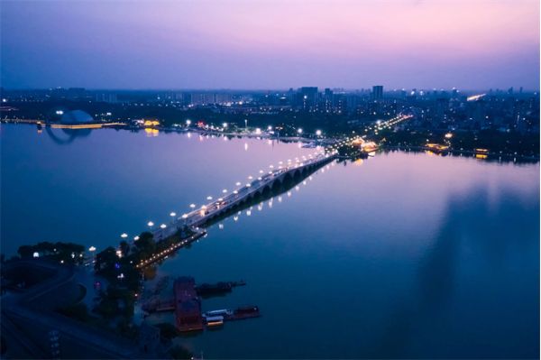 天光云影,碧波萬頃,不外如是。橋上是車水馬龍,車下便是萬家燈火。