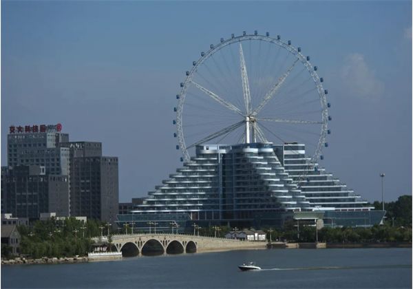 中華路徒駭河大橋的橋塔造型在設(shè)計的時候,便融合了水城的概念,將一顆圓潤的明珠托舉在空中旋轉(zhuǎn),朦朧的夜色之下,現(xiàn)代的霓虹燈柔和又絢爛。