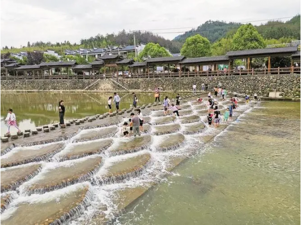 來(lái)到崇際村網(wǎng)紅打卡景點(diǎn)龍鱗壩,只見(jiàn)全長(zhǎng)45米的長(zhǎng)壩由一個(gè)個(gè)矴步組成。溪水穿過(guò)撞擊矴步后,形成層層疊疊的白色水花,既壯觀又解壓,成了市民游客喜愛(ài)的打卡點(diǎn)。來(lái)自上海的游客張莉說(shuō):“這里的生態(tài)太好了,水非常清澈,踩在水花里打水仗,很好玩?!?