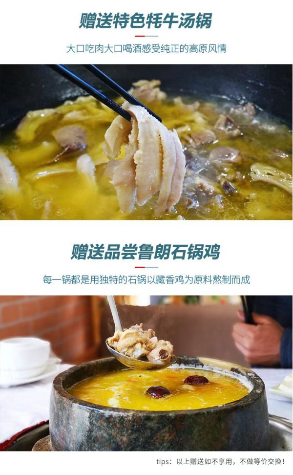 l 贈(zèng)送2頓特色餐(1頓特色牦牛湯鍋+1頓魯朗石鍋雞);