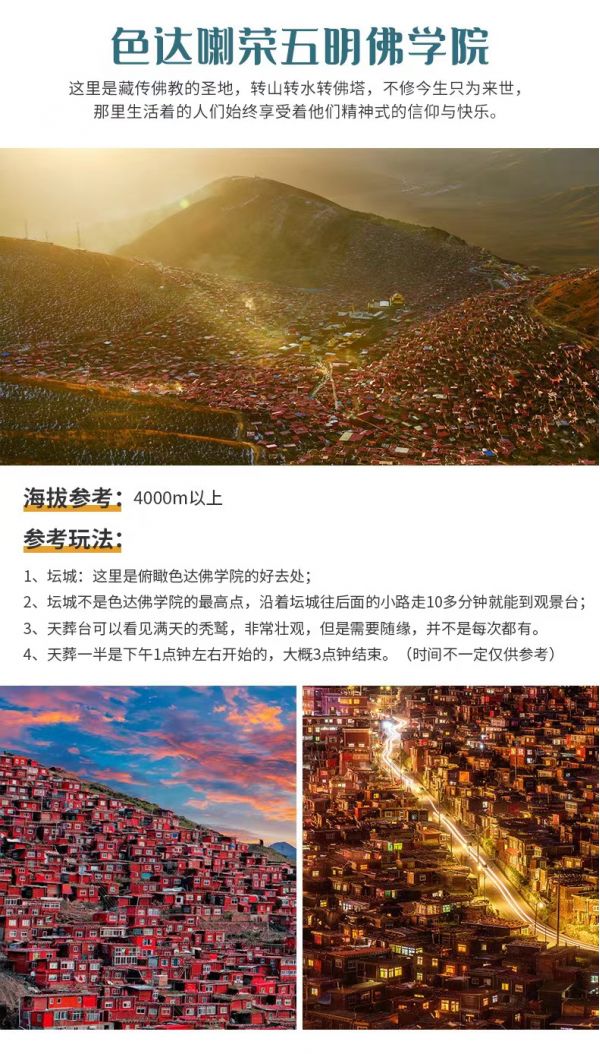 3、行程中不只色達(dá)一個(gè)景點(diǎn),還有更美好的景點(diǎn)等待大家,預(yù)祝大家旅途愉快!