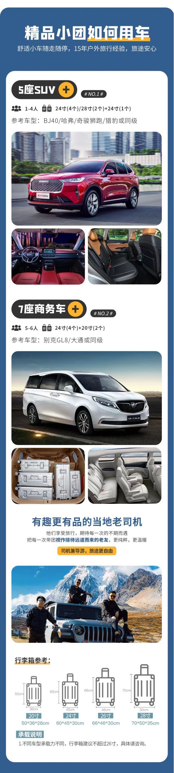 服務(wù):由經(jīng)驗(yàn)豐富的司機(jī)供向?qū)Х?wù);司機(jī)不進(jìn)入景區(qū),但提供酒店拿房、行程安排等服務(wù),望您諒解。