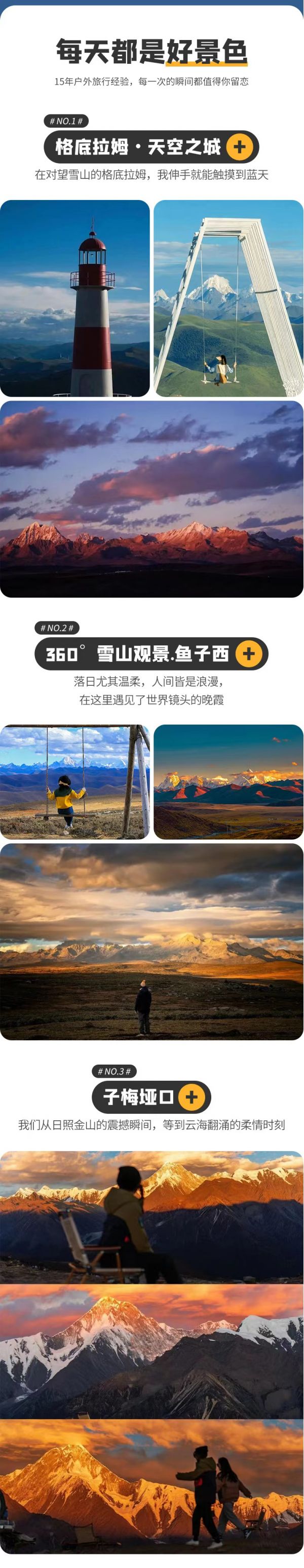 2、若格底拉姆·天空之城、魚子西因下雪或者管制需要中轉(zhuǎn)車進(jìn)入,費(fèi)用自理。若領(lǐng)隊(duì)陪同上山,中轉(zhuǎn)車費(fèi)客人負(fù)責(zé)AA。如果魚子西森林防火期間則取消,在格底拉姆看日落。