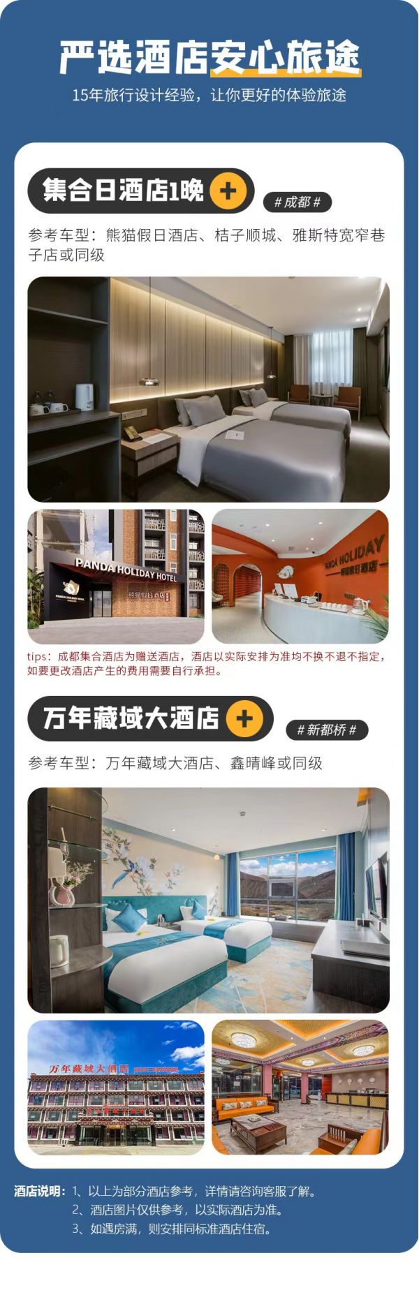 住宿:成都酒店標(biāo)間1晚(tips:成都集合酒店為贈(zèng)送酒店,酒店以實(shí)際安排為準(zhǔn)均不換不退不指定,如要更改酒店產(chǎn)生的費(fèi)用需要自行承擔(dān)。),新都橋酒店標(biāo)間2晚,上木居/玉龍西客棧標(biāo)間1晚 (冷噶措住宿條件有限,請謹(jǐn)慎報(bào)名)(僅供參考,實(shí)際以訂房為準(zhǔn)):