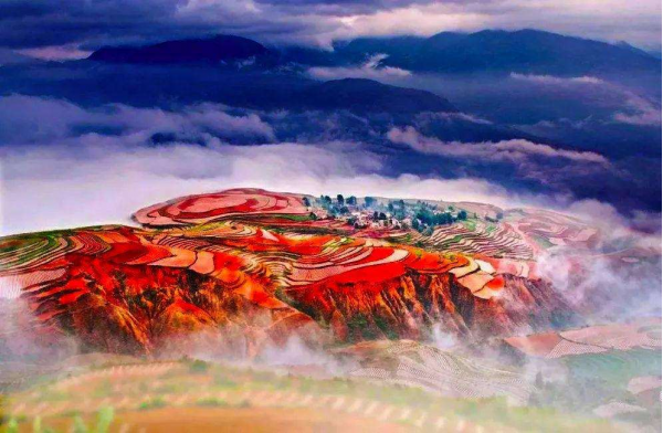 東川紅土地位于昆明市東川區(qū)西南40多公里的新田鄉(xiāng)、一個叫"花石頭"(在109公里程碑處)的地方,這里方圓近百里的區(qū)域是云南紅土高原上最集中、最典型、最具特色的紅土地,被專家認(rèn)為是全世界除巴西里約熱內(nèi)盧外最有氣勢的紅土地,而其景象比巴西紅土地更為壯美。第一眼看到那色彩那層次那線條,便忍不住嘆息,真美啊……美得太不真實(shí)了!放眼望去,山川和原野呈現(xiàn)出一片片暗紅、紫紅、磚紅等不同的紅色,方圓數(shù)百里大大小小的各個山頭、山坡上,油菜花、洋芋花熱烈地綻放,金色的麥浪在清涼的山風(fēng)下一浪掀起一浪,一層綠,一層白,一層紅,一層金,鮮艷濃烈的色塊一直鋪向天邊,看似漫不經(jīng)心,卻又形成如畫般五彩繽紛的圖案。遠(yuǎn)遠(yuǎn)看去,仿佛上天涂抹的色塊,色彩斑斕炫目、艷麗飽滿,有著優(yōu)美的線條,又勾畫得如此濃墨重彩。