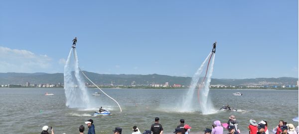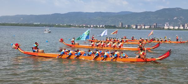 當(dāng)日上午,天氣晴朗,晉陽湖碧波蕩漾,精彩的水上飛人表演吸引了許多游客觀看。岸上鼓聲陣陣,精彩的舞龍表演引來陣陣掌聲。伴隨著熱鬧的鑼鼓聲,4條龍舟“披紅點(diǎn)睛”禮成后下水巡湖,拉開了晉陽湖首屆龍舟競賽的序幕。據(jù)介紹,從6月23日開始,8組來自晉源各鎮(zhèn)(街)的龍舟代表隊(duì)和17組企業(yè)龍舟代表隊(duì)將在晉陽湖公園東岸觀湖長廊飛舟競渡,展示歷史與現(xiàn)代交融、傳統(tǒng)與潮流并匯的城市氣息。