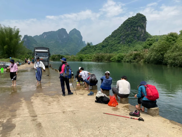 游覽陽朔風(fēng)景如畫的線路【十里畫廊】車觀(游覽時間約20分鐘),陽朔十里畫廊位于陽朔月亮山,因沿路風(fēng)景秀麗,如詩如畫,被稱為陽朔十里畫廊。主要景觀有佩桃獻壽、海豚出水、尼姑下山、火焰山、八戒曬肚、金貓出洞、馬象奇石、龍角山、猴子民愁、駱駝過江、青厄風(fēng)光、古榕美景、美女梳妝等。人在路上走,如在畫中游,說不完的妙處。清風(fēng)迎面吹來,望著兩旁的青山綠樹,行走在鄉(xiāng)村阡陌,品花香、稻香、泥香,一路拍拍走走,沿途的奇山秀水,近距離感受著桂林山水之美、獨特的喀斯特地貌和那清澈的漓江水。沿途,我們還會欣賞到著名陽朔美景【駱駝過江】,十里畫廊東側(cè),工農(nóng)橋旁望去,在一望無際的田園間,田家河像條白絹,宛然曲折東流,河邊有一山,酷如駱駝,形態(tài)似自得漫步,前往欲過河,人稱“駱駝過江”。