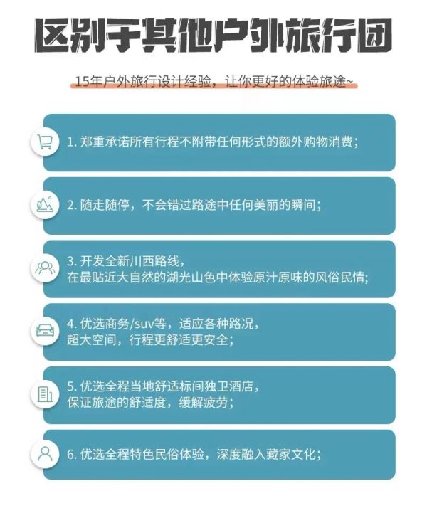 4、如途中遇不可抗因素(如高原反應、修路、塌方、車輛事故阻礙等)我方有權根據(jù)情況調(diào)整行程線路走向,此舉均是根據(jù)帶隊經(jīng)驗為大家更順利的游玩而做出的改變,希望大家理解和支持,但如造成額外費用由客人自理,望您諒解;若對行程造成影響的,我方將全力協(xié)助游客進行解決,但不承擔由此造成的損失,若因此而增加的費用,敬請游客自理。