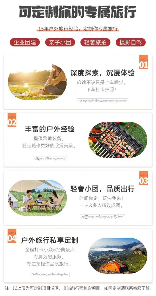 私人訂制:我們業(yè)務范圍囊括了全國各大城市,川西、西北、新疆、西藏,在路上永遠有我們的身影。我們將為每一個有定制需求的你策劃出獨屬于自己的完美旅行。