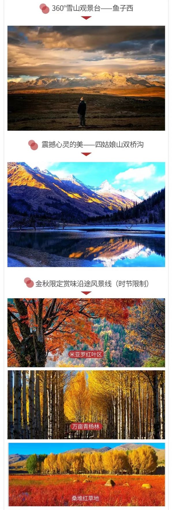 特色介紹:沖古寺、珍珠海、赤土河谷、波瓦山、萬畝青楊林、稻城白塔 兔兒山 海子山
