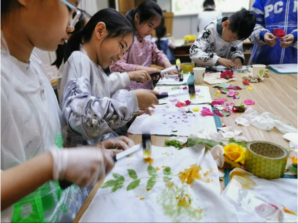 扎染和拓染是我國民間特有的印染技術(shù),是非物質(zhì)文化遺產(chǎn),其工藝從扎到染、從拓到染都具有豐富的創(chuàng)造性。首先,老師以故事的形式講解了扎染的由來及制作過程,同學(xué)們都躍躍欲試。但是在扎繩子的時候同學(xué)們卻犯了難,不知道怎么樣扎出自己想要的圖案。通過老師講解、示范,同學(xué)們有了思路,經(jīng)過自己的探索,扎出了各種形狀,涂染上不同的顏料;拓染活動又引爆了同學(xué)們的興奮點,同學(xué)們揮動著錘頭,敲打著早已經(jīng)準備好的花草,期待著完成后的驚喜。