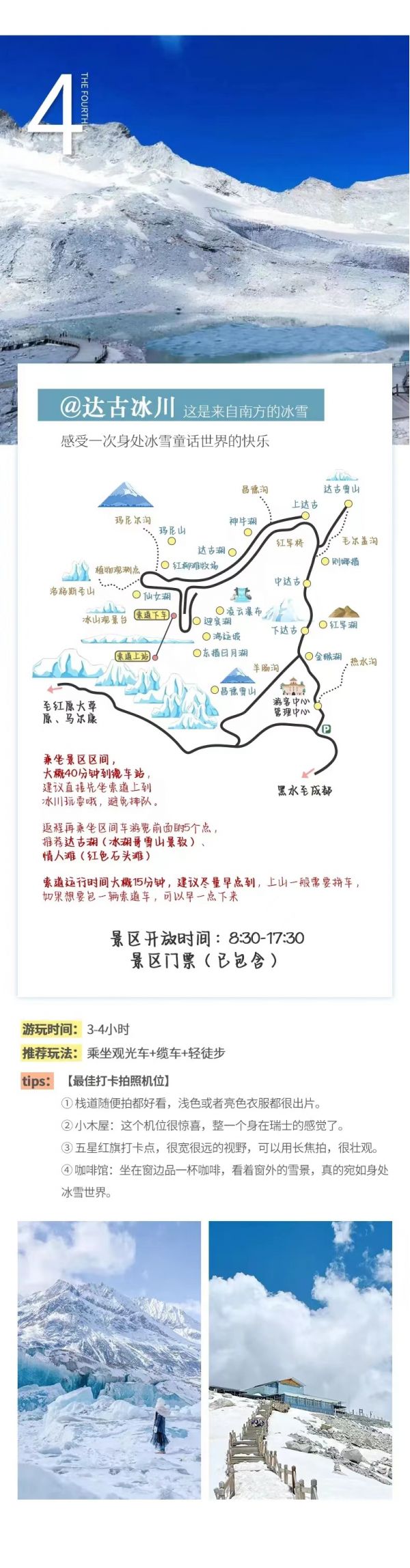 (1)達(dá)古冰川景區(qū)山頂海拔達(dá)到4860米,可乘坐索道抵達(dá),您可根據(jù)自身身體狀況選擇前往,進(jìn)景區(qū)后請(qǐng)不要?jiǎng)×疫\(yùn)動(dòng),景區(qū)內(nèi)有大型天然氧吧,如有不適應(yīng)可以進(jìn)氧吧休息。