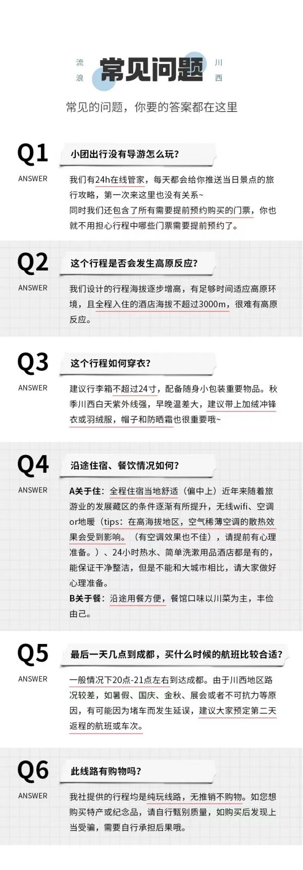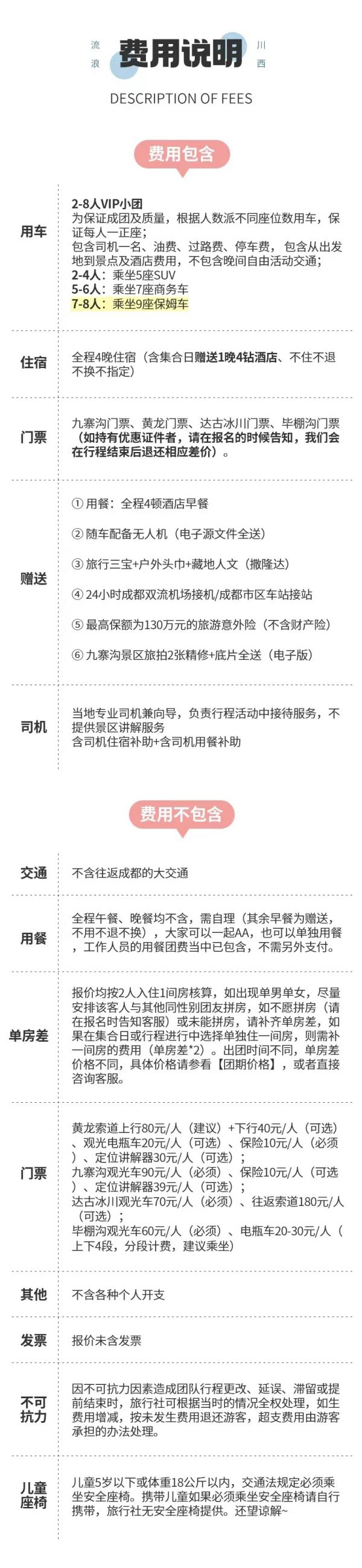 (1)受天氣、堵車等客觀因素影響,當(dāng)日回成都比較晚,請(qǐng)盡量不預(yù)訂當(dāng)天的返程機(jī)票或火車票,以免因?yàn)槎萝嚱o您帶來(lái)沒(méi)有必要的損失。