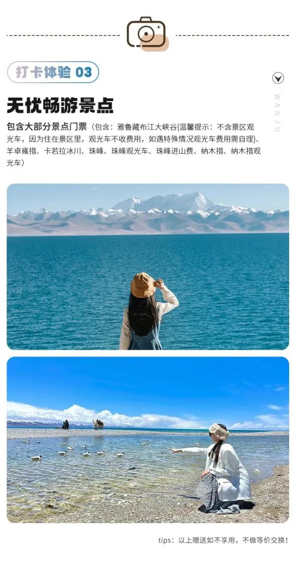 門票:包含雅魯藏布江大峽谷{溫馨提示:不含景區(qū)觀光車,因?yàn)樽≡诰皡^(qū)里,觀光車不收費(fèi)用,如遇特殊情況觀光車費(fèi)用需自理}、羊卓雍措、卡若拉冰川、珠峰大本營(yíng)門票、珠峰觀光車、珠峰進(jìn)山費(fèi)、納木措、納木措觀光車。