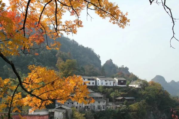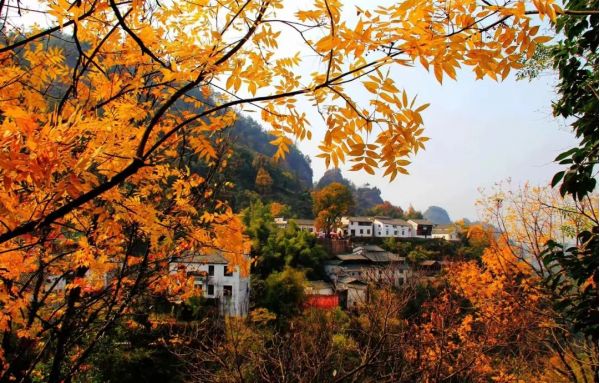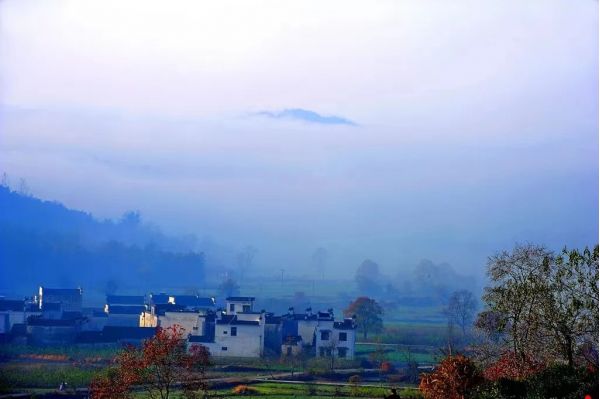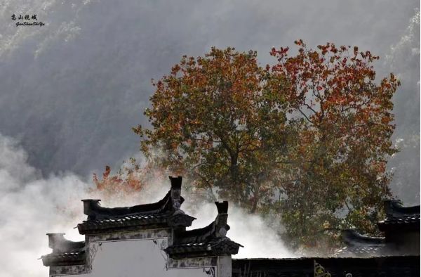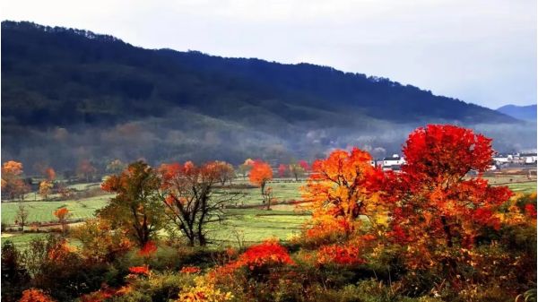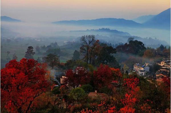 塔川烏桕樹經(jīng)過霜降,由綠變黃,由黃變紅,漸變出調(diào)色板般豐富的色彩。塔川的清晨極美,薄薄的霧氣似有似無,籠罩在山腰,林間,農(nóng)家的小屋若隱若現(xiàn),紅楓叢中小露飛檐翹角,黃葉微隙掩映粉墻黛瓦,如中國(guó)山水畫般詩(shī)情畫意。