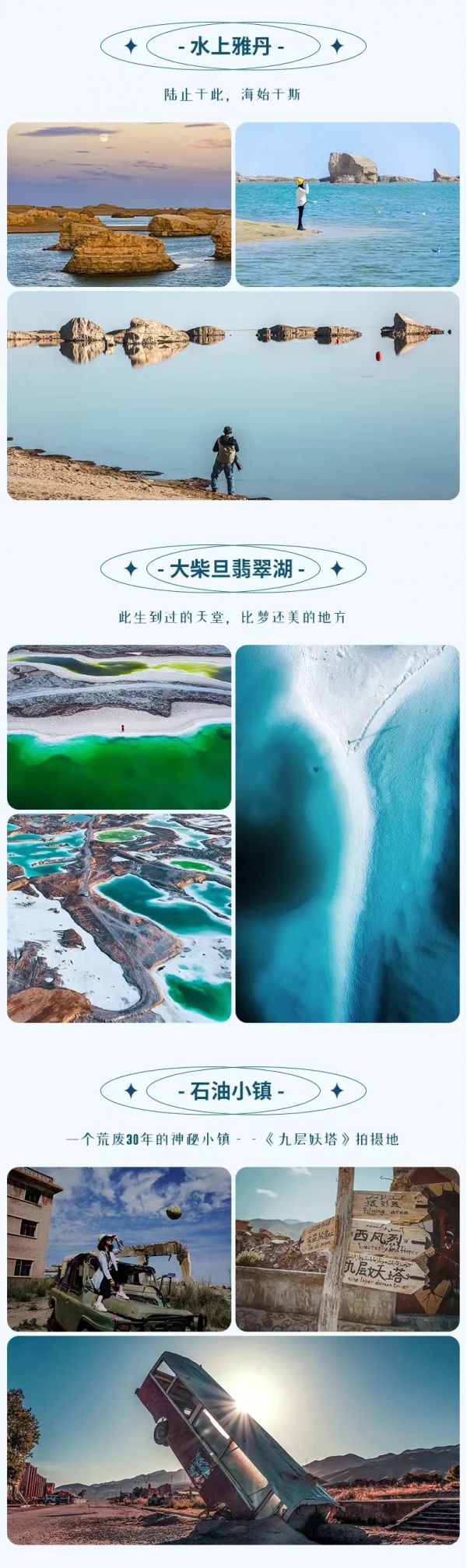 青海湖+茶卡鹽湖+穿越柴達(dá)木盆地+U型公路+水上雅丹+大柴旦翡翠湖+阿克塞石油小鎮(zhèn)+莫高窟+鳴沙山月牙泉+嘉峪關(guān)關(guān)城+張掖七彩丹霞+祁連大草原