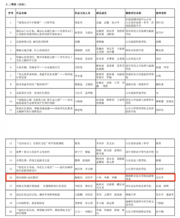由山東省總工會(huì)、山東省文化和旅游廳、山東省新舊動(dòng)能轉(zhuǎn)換綜合試驗(yàn)區(qū)建設(shè)辦公室、山東省人力資源和社會(huì)保障廳、山東省教育廳、山東省農(nóng)業(yè)農(nóng)村廳、山東省精品旅游促進(jìn)會(huì)共同主辦,山東省精品旅游促進(jìn)會(huì)組織實(shí)施的“2023第四屆山東省研學(xué)旅行創(chuàng)新線路設(shè)計(jì)大賽暨首屆山東省研學(xué)旅行指導(dǎo)師技能大賽”的評(píng)審工作,嚴(yán)格按照統(tǒng)一報(bào)名參賽、網(wǎng)絡(luò)投票、專家評(píng)審、組委會(huì)審核等程序,研究確定了獲獎(jiǎng)名單。聊城職業(yè)技術(shù)學(xué)院旅游管理系師生工作室團(tuán)隊(duì)不負(fù)眾望,喜獲“2023第四屆山東省研學(xué)旅行創(chuàng)新線路設(shè)計(jì)大賽”二等獎(jiǎng)。