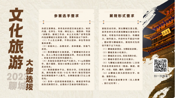 此次聊城文化旅游大使選拔活動,將通過“線上海選+線下決賽+全平臺展示”的融媒體營銷模式,為聊城市選拔一批有能力、有涵養(yǎng)、有創(chuàng)意的聊城文化旅游大使,他們將作為聊城文化旅游的傳播者和代言人,助力聊城文化旅游全新形象打造,實現(xiàn)聊城文旅出圈。