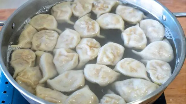 16、煮開后點(diǎn)三次水,直到餃子全部煮到飄起來,圓鼓鼓的就熟了。
