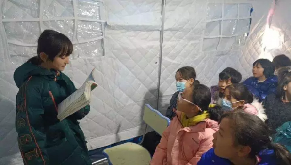22號(hào)上午在位于甘肅省積石山縣石塬鎮(zhèn)肖紅坪村的一個(gè)臨時(shí)安置點(diǎn),總臺(tái)記者在采訪時(shí)聽(tīng)到了朗朗的讀書(shū)聲,這里搭建起了甘肅震區(qū)首個(gè)帳篷學(xué)校。