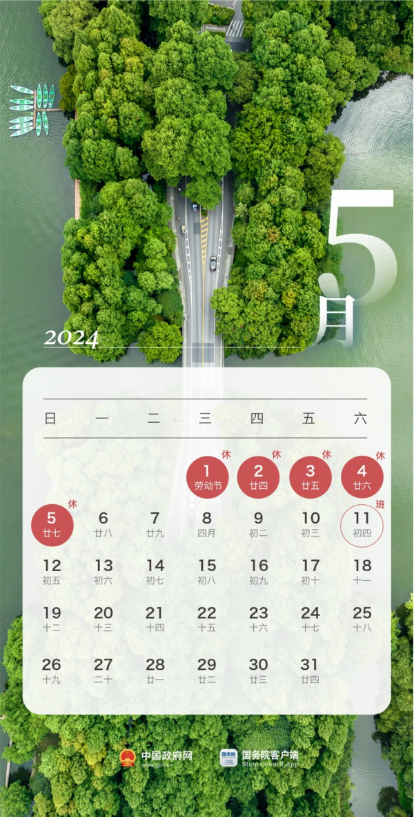 四、勞動節(jié):5月1日至5日放假調休,共5天。4月28日(星期日)、5月11日(星期六)上班。
