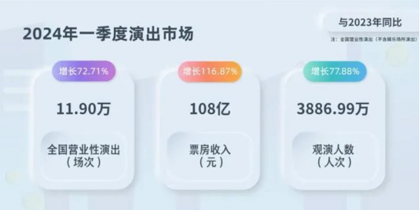 “復(fù)蘇即狂熱”。中國(guó)演出行業(yè)協(xié)會(huì)發(fā)布的數(shù)據(jù)顯示,2024年一季度,全國(guó)營(yíng)業(yè)性演出(不含娛樂場(chǎng)所演出)場(chǎng)次11.90萬場(chǎng),相當(dāng)于全國(guó)范圍內(nèi)日均超過1300場(chǎng)。