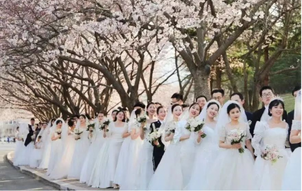 中國海洋大學(xué)在櫻花樹下舉辦2024校友集體婚禮
