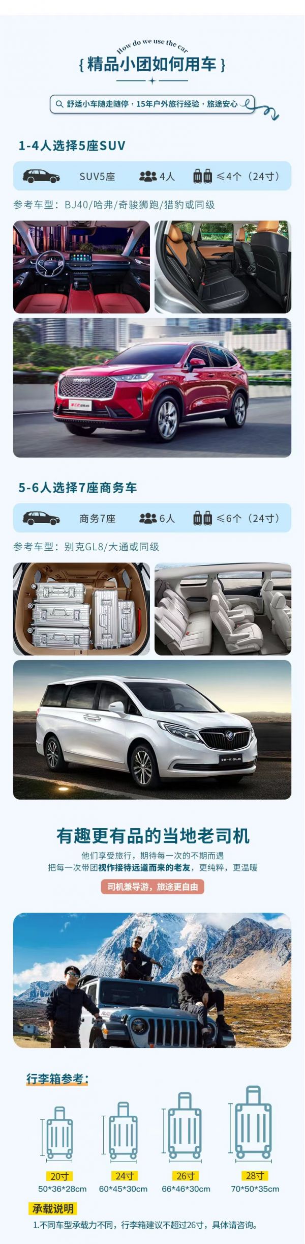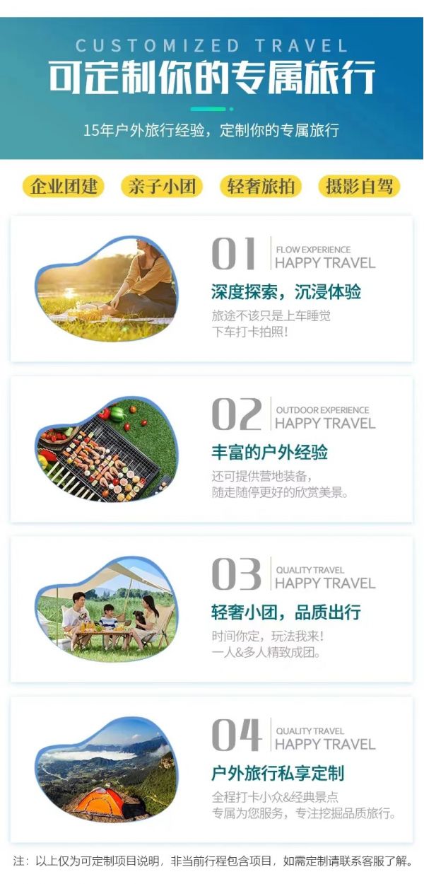 私人訂制:我們業(yè)務(wù)范圍囊括了全國各大城市,川西、西北、西藏、新疆,在路上永遠(yuǎn)有我們的身影。我們將為每一個有定制需求的你策劃出獨屬于自己的完美旅行。