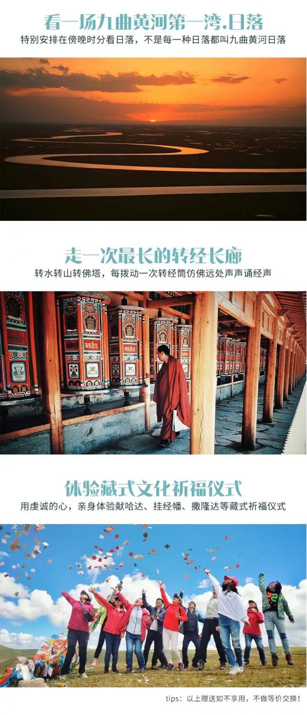 繼續(xù)往前【拉卜楞寺】,有“世界佛學(xué)院”之稱的【拉卜楞寺】。拉卜楞寺是藏傳佛教格魯派六大宗主寺之一 , 規(guī)模僅次于布達(dá)拉宮,是藏傳佛教格魯派最高佛學(xué)學(xué)府之一,被世界譽(yù)為“世界藏學(xué)府”,相當(dāng)于我們眼中的“清華北大”。在漫長的發(fā)展中拉卜楞寺形成了獨特的藏傳佛教文化,包括建筑、學(xué)院、法會、佛教藝術(shù)、藏經(jīng)等,曾經(jīng)是甘、青、川毗鄰地區(qū)藏族的政治、宗教、文化中心。在學(xué)院堪布的帶領(lǐng)下來,進(jìn)入寺院,欣賞美麗的壁畫、唐卡,精美佛像;走過朱紅玄黃長廊,和喇嘛一起撥動轉(zhuǎn)經(jīng)筒;在這紅白相間的宏偉寺院中,看虔誠的信徒磕著等身長頭來此轉(zhuǎn)經(jīng);與僧人一起聽經(jīng)、打坐,靜靜感受這份信仰的力量。而后經(jīng)過【瑪曲】,母親河黃河這里自西南入境,復(fù)從西北出境。