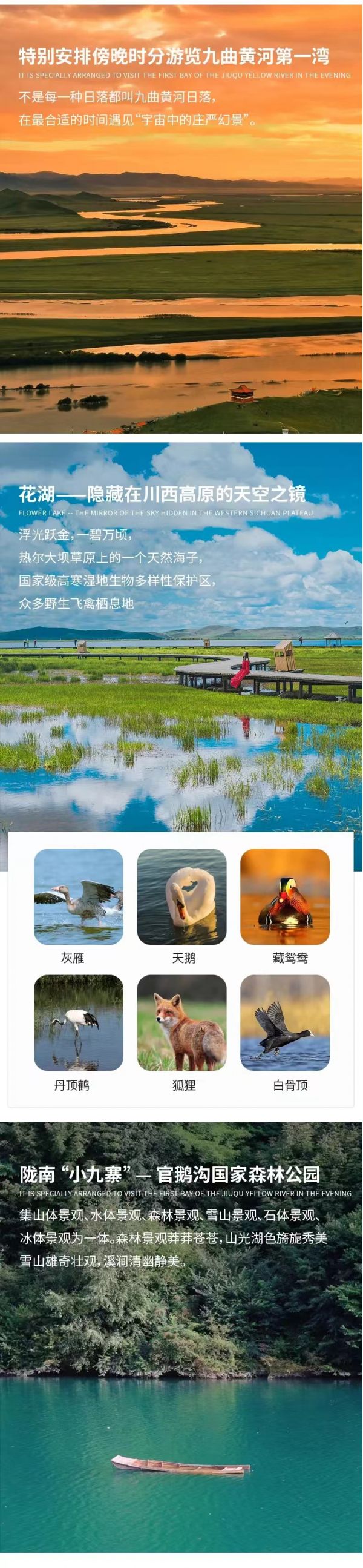 然后我們前往草原湖泊【花湖】。在僅次于呼倫貝爾草原的熱爾大壩草原之上,有一個絕美的天然海子---花湖?;ê竦貙儆趪壹壐吆疂竦厣锒鄻有员Wo(hù)區(qū),是眾多野生飛禽的主要棲息地,如灰雁、白骨頂、天鵝、黑頸鶴、丹頂鶴、藏鴛鴦、狐貍等?;ê南奶旌颓锾靹e有一番風(fēng)味。夏天,號稱“天空之境”的花湖,周邊開滿野花,美輪美奐。秋天,廣闊的草原變成一片金黃,藍(lán)色的花湖被包圍其中,仿佛金色地毯上的一顆藍(lán)寶石。湖邊建有木質(zhì)棧道,一直延伸到水中,可以沿著棧道走到濕地深處,沿途都可以找到拍大片的好角度。