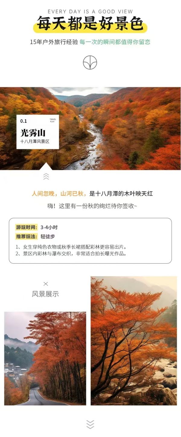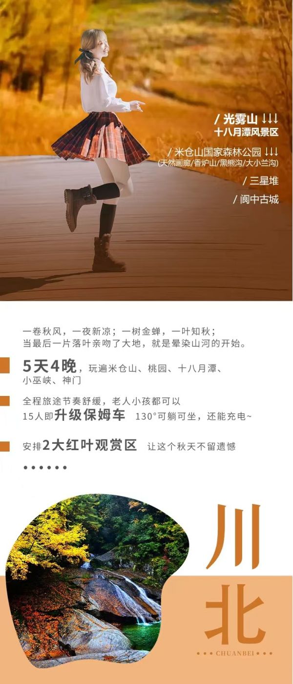 早餐后出發(fā),經(jīng)成巴高速抵達(dá)位于川東北的巴中【光霧山】,光霧山被譽(yù)為“中國(guó)紅葉第一山”,因常年云霧繚繞而得名,每年10月~11月是觀賞光霧山紅葉的最佳時(shí)機(jī)?!臼嗽绿丁渴遣卦诠忪F山深處的動(dòng)人篇章,曾有人說(shuō):十八月潭是川東北的“九寨溝”,瀑布似九寨,紅葉絕天下。在長(zhǎng)約3.5公里的珍珠溝內(nèi),密布著18個(gè)恍若神造仙成的瀑潭,每個(gè)潭形似月桂,基本上有一相映的瀑布,謂之“十八月潭”。大小水潭似顆顆珍珠綴成的長(zhǎng)長(zhǎng)珠鏈,沿溝飛瀉的瀑流如粒粒珍珠鋪就的幅幅珠簾。漫步其間,潭水相連,時(shí)而穿過(guò)大片彩林,一瀉千里,時(shí)而一片靜謐,明凈幽藍(lán)。登高俯瞰,滿(mǎn)目流金瀉玉、彩虹波動(dòng),尤如串串珍珠藏于溝壑溪澗。步入十八月潭,如在畫(huà)中游,讓你陶醉得駐足不前??催^(guò)秋景后前往光霧山鎮(zhèn)入住。