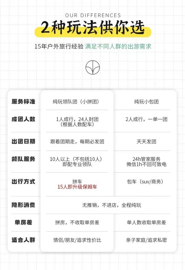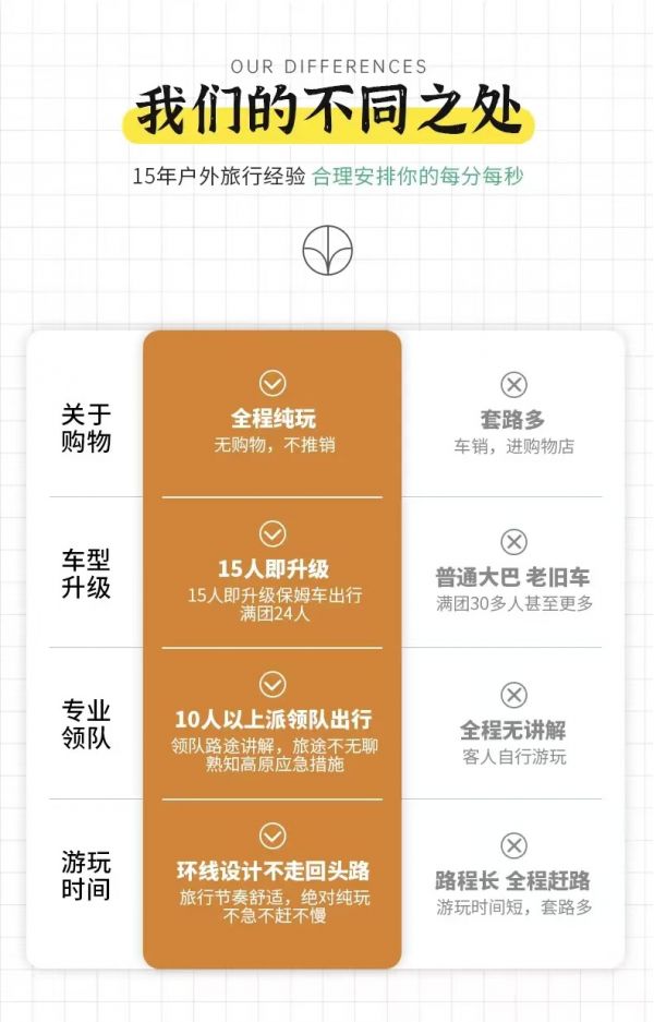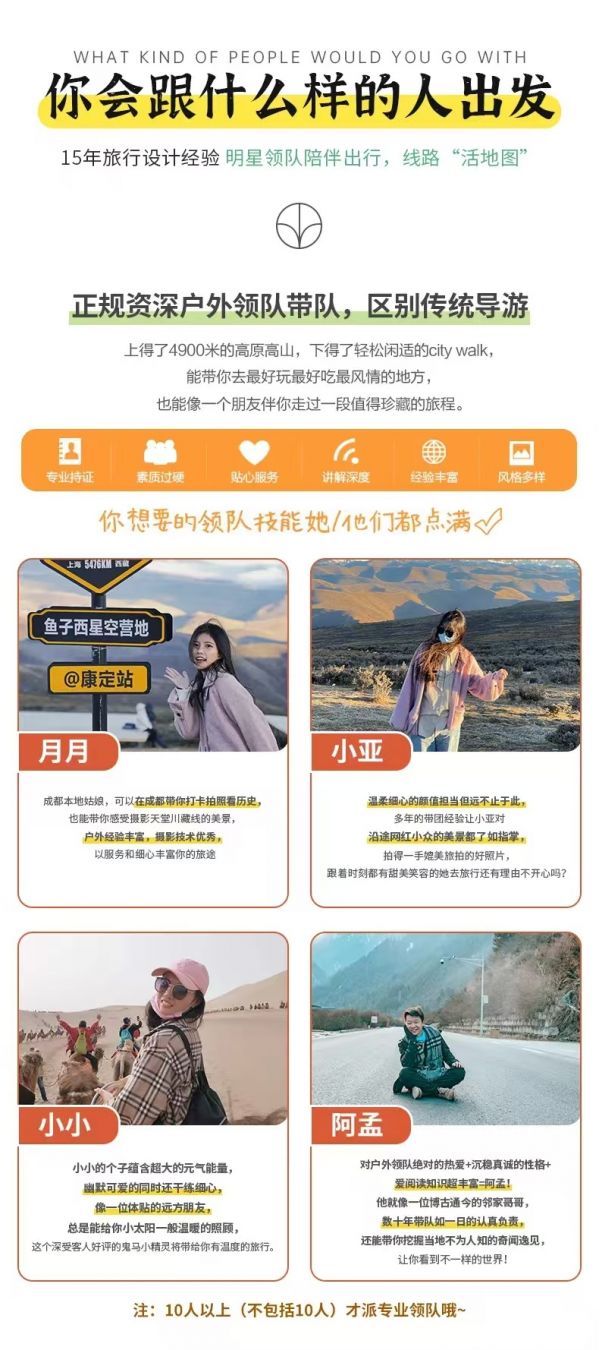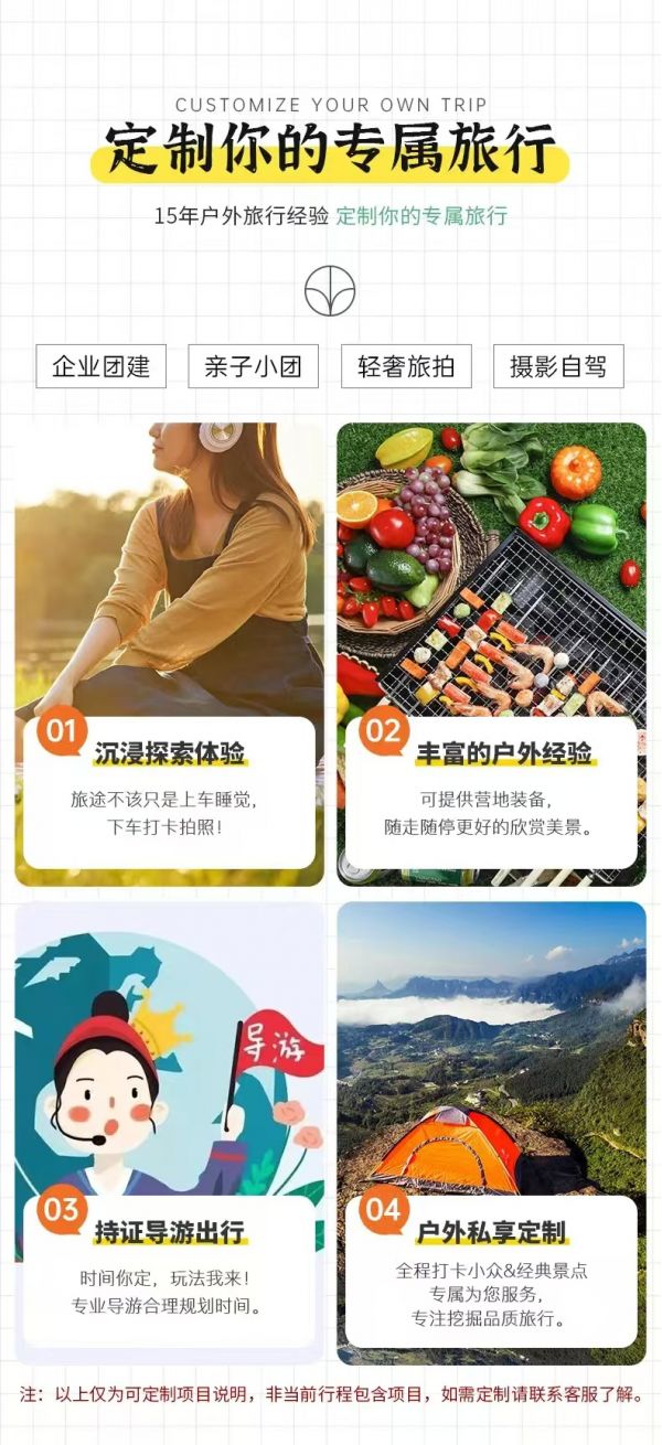 私人訂制:我們業(yè)務(wù)范圍囊括了全國(guó)各大城市,川西、西北、新疆,在路上永遠(yuǎn)有我們的身影。我們將為每一個(gè)有定制需求的你策劃出獨(dú)屬于自己的完美旅行。