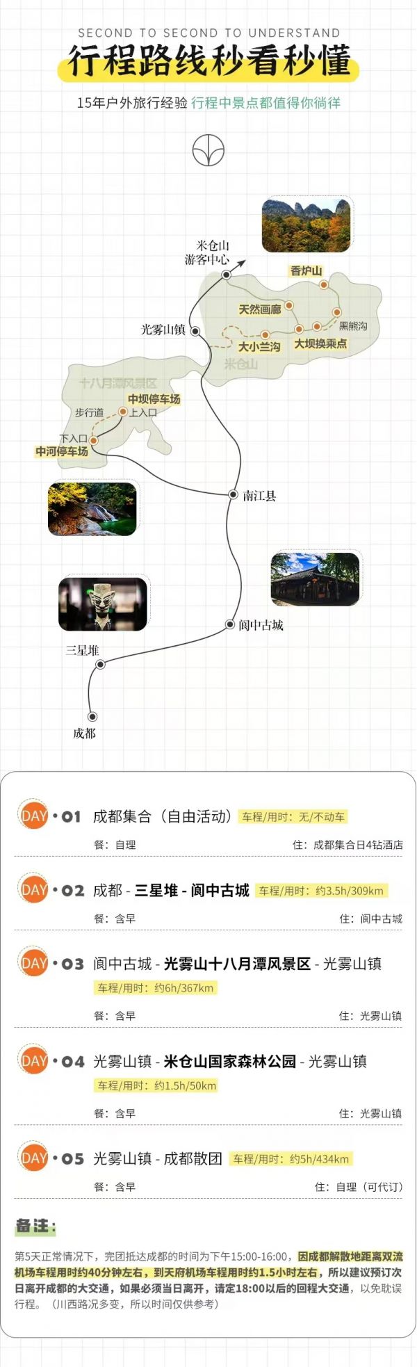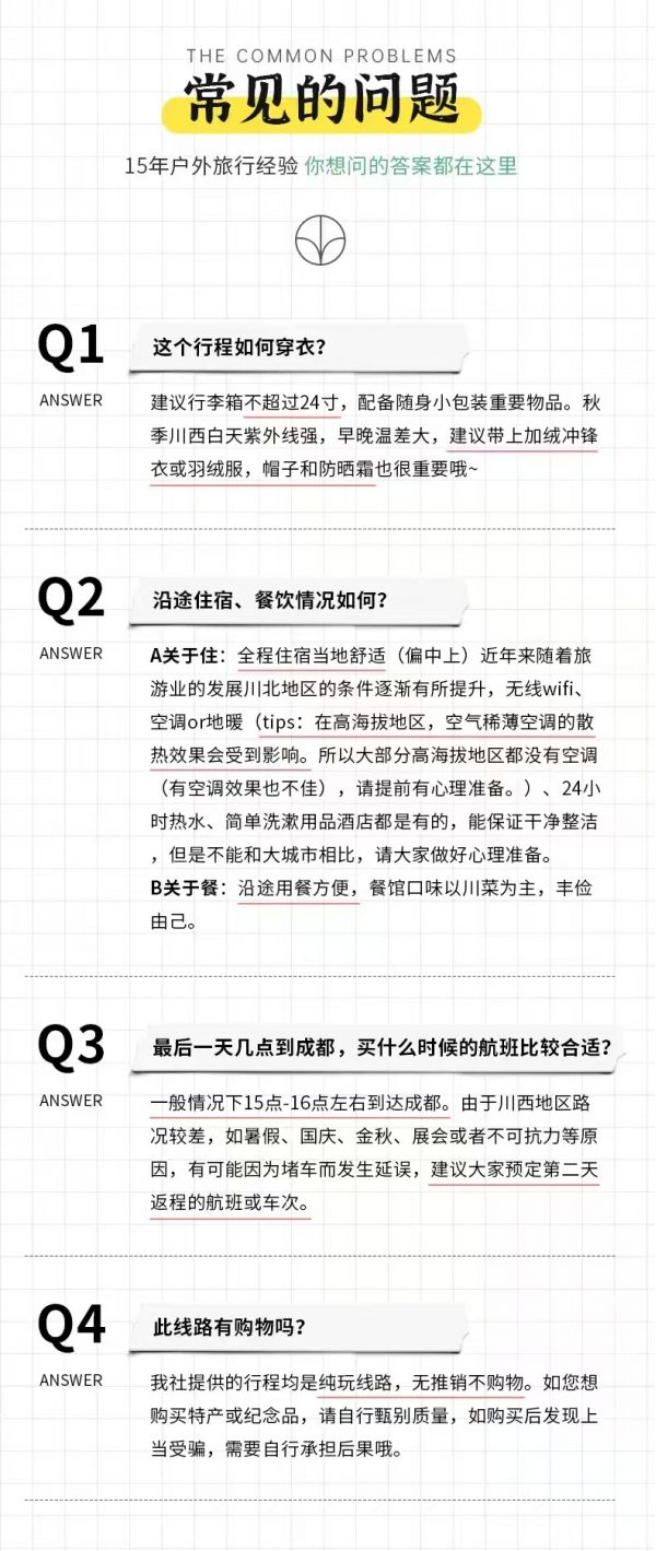 (2)正常情況下,抵達(dá)成都的時(shí)間為下午15:00-16:00,如果必須當(dāng)日離開(kāi),請(qǐng)定18:00以后的回程大交通,以免耽誤行程,敬請(qǐng)諒解;