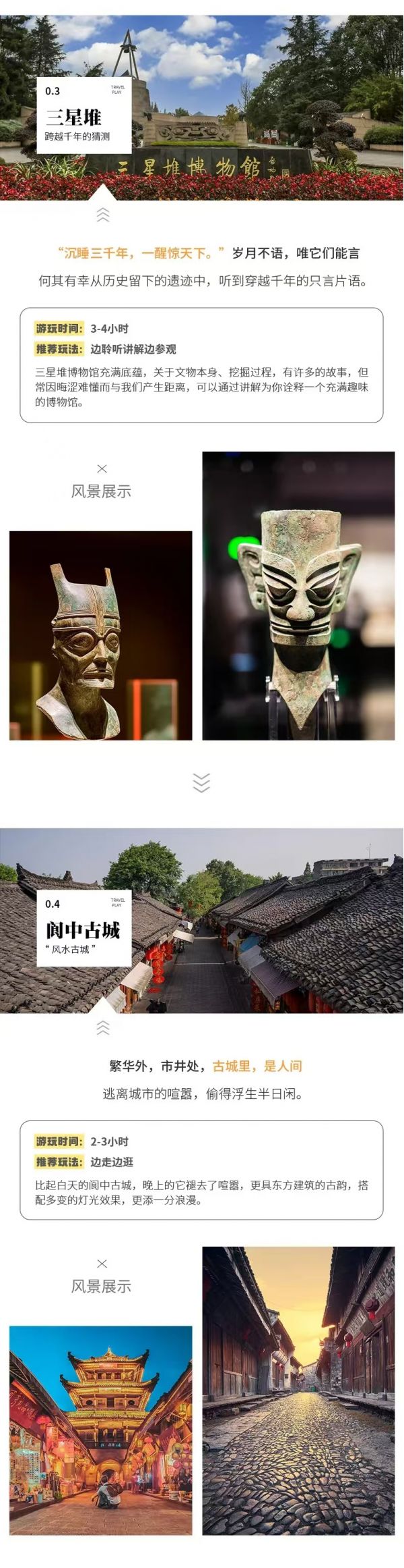 早晨從成都酒店出發(fā),大家相互認(rèn)識(shí),相互熟悉,一路歡歌笑語(yǔ),充滿(mǎn)期待。隨后抵達(dá)【三星堆博物館】開(kāi)始參觀,三星堆古遺址距今已有3000至5000年歷史,是迄今在西南地區(qū)發(fā)現(xiàn)的范圍最大、延續(xù)時(shí)間最長(zhǎng)、文化內(nèi)涵最豐富的古城、古國(guó)、古蜀文化遺址。在這批古蜀秘寶中,有許多光怪陸離奇異詭譎的青銅造型,有高2.62米的【青銅大立人】、有寬1.38米的【青銅面具】、更有高達(dá)3.95米的【青銅神樹(shù)】等,均堪稱(chēng)獨(dú)一無(wú)二的曠世神品。而以流光溢彩的金杖為代表的金器,以滿(mǎn)飾圖案的邊璋為代表的玉石器,亦多屬前所未見(jiàn)的稀世之珍。游覽后繼續(xù)出發(fā),下午抵達(dá)【閬中古城】,古城山圍四面,水繞三方,有著2300多年的歷史,與安徽黃山的徽州古城、山西平遙的平遙古城和云南麗江的麗江古城并稱(chēng)為中國(guó)四大古城,如果說(shuō)麗江古城是風(fēng)花雪月,那么閬中古城便是人間煙火,古城里時(shí)不時(shí)飄出的陣陣醋香更是久久縈繞在心頭,古城所蘊(yùn)含的三國(guó)文化、春節(jié)文化、科舉文化更是值得深入探究。晚上我們?nèi)胱」懦侵苓叄绕鸢滋斓拈佒泄懦?,晚上的它褪去了喧囂,更具東方建筑的古韻,搭配多變的燈光效果,更添一分浪漫。