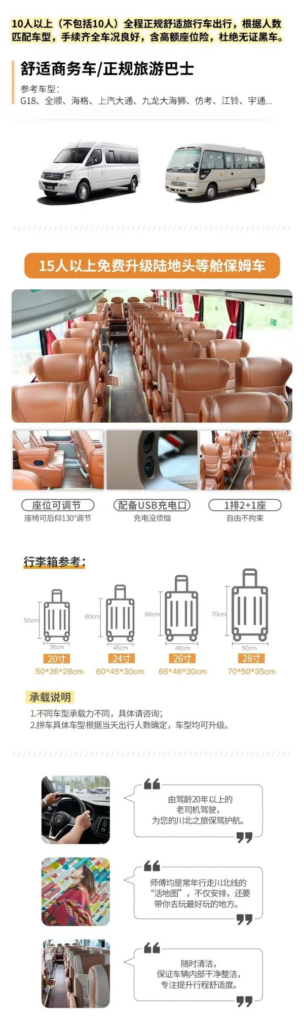 交通:根據(jù)人數(shù)確定車(chē)輛,15人即升級(jí)保姆車(chē)(已含駕駛員食宿)