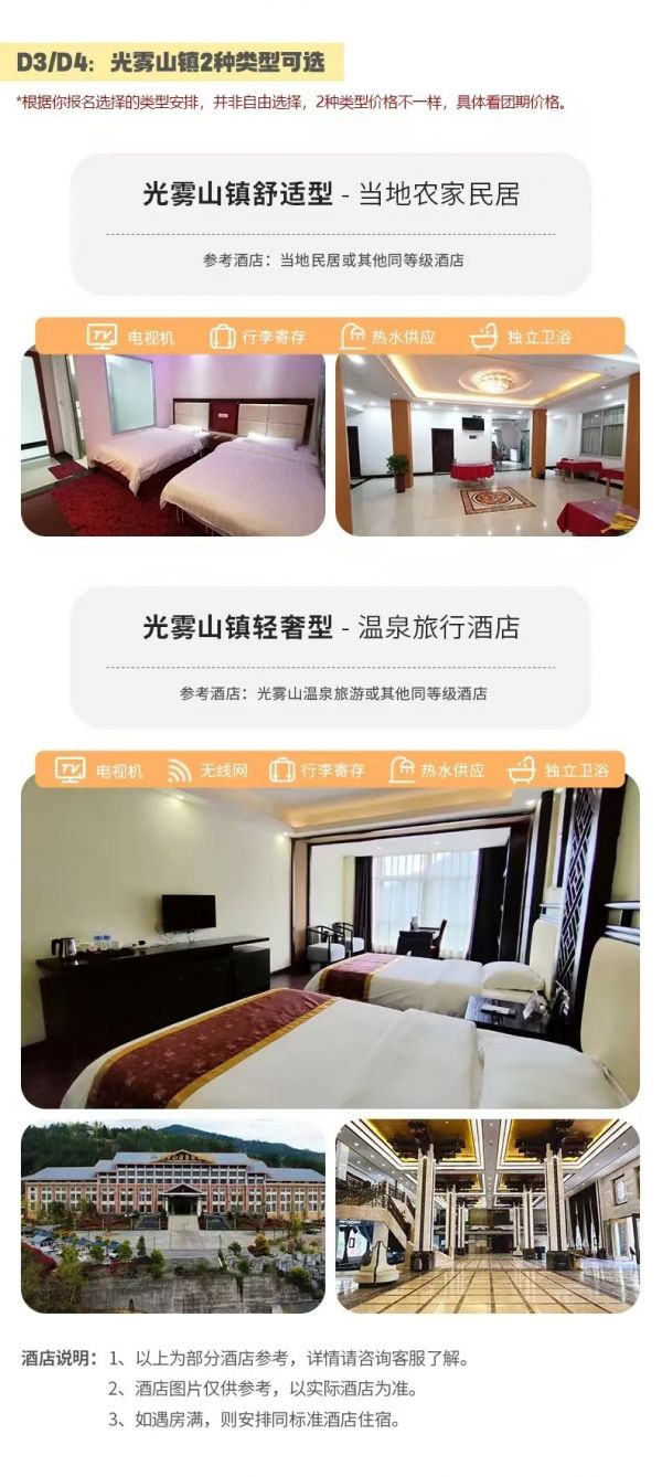 光霧山鎮(zhèn)因深處川東北山區(qū),住宿條件有限,請(qǐng)大家對(duì)酒店合理期待,但我們提供了輕奢/舒適2檔類(lèi)型酒店可供選擇。