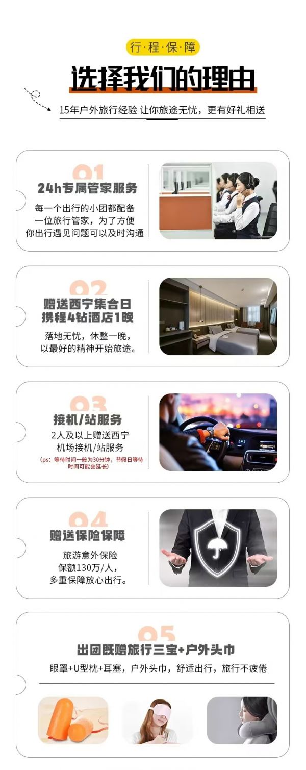接機(jī)/站服務(wù):本次活動(dòng)提供西寧市內(nèi)24小時(shí)接機(jī)/接站服務(wù),工作人員會(huì)在您出發(fā)日期前一天21:30之前向您推送消息并與您聯(lián)系,如果超過(guò)時(shí)間沒(méi)有接到任何通知,請(qǐng)及時(shí)與報(bào)名處聯(lián)系。(接站等待時(shí)間一般為15-20分鐘,最長(zhǎng)不超30分鐘,節(jié)假日拼單人數(shù)較多情況下客人等待時(shí)間可能會(huì)延長(zhǎng))。