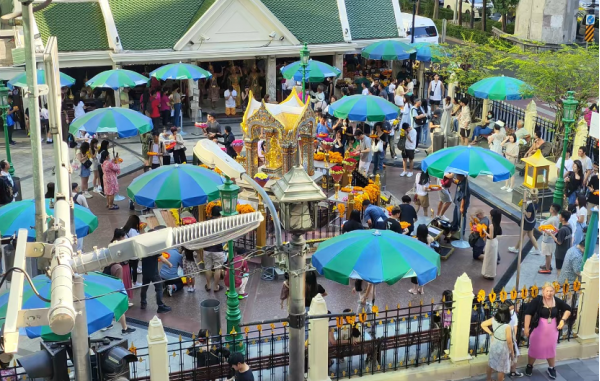 前往【皇家寺】,寺中供奉著佛像可供游客為家人祈福,我們先去拜泰國(guó)的四面佛。 四面佛的四面順時(shí)針?lè)较虻谝幻媲笃桨?、第二面求事業(yè)、第三面求愛(ài)情婚姻、第四面求金錢(qián)。燒一套香燭,插一小束花在佛前,據(jù)說(shuō)是很靈的。