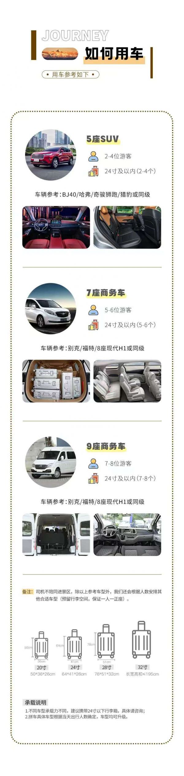 為保證成團及質(zhì)量,根據(jù)人數(shù)派不同座位數(shù)用車,保證每人一正座;