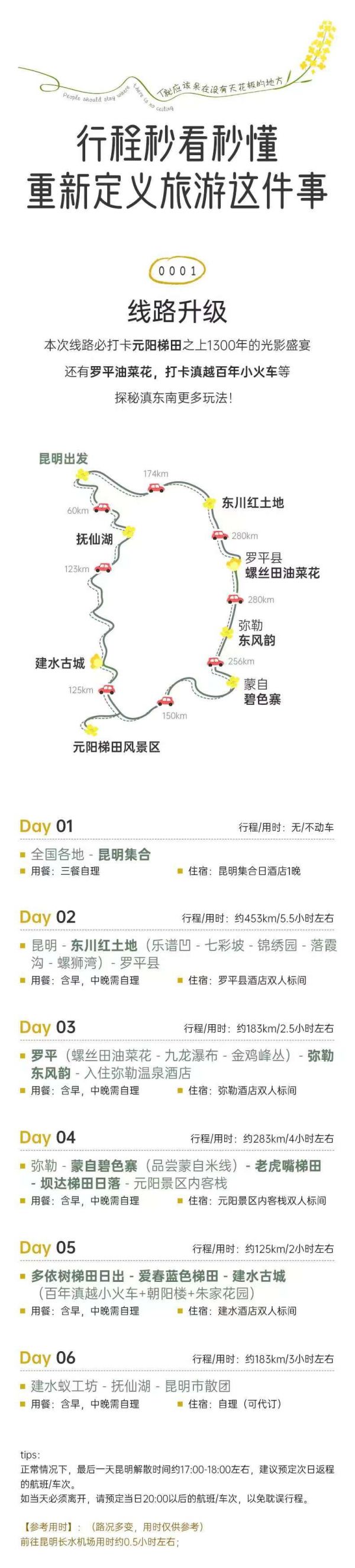 溫馨提示:春天的羅平滿眼都是金燦燦的黃,幾十萬畝油菜花滿山偏野地開放,非常充裕的時間留給您盡情拍照,還為您準備了特色民族服裝讓您盡情地放飛自我,凹造型!晚上彌勒的美食您也不能錯過喲。