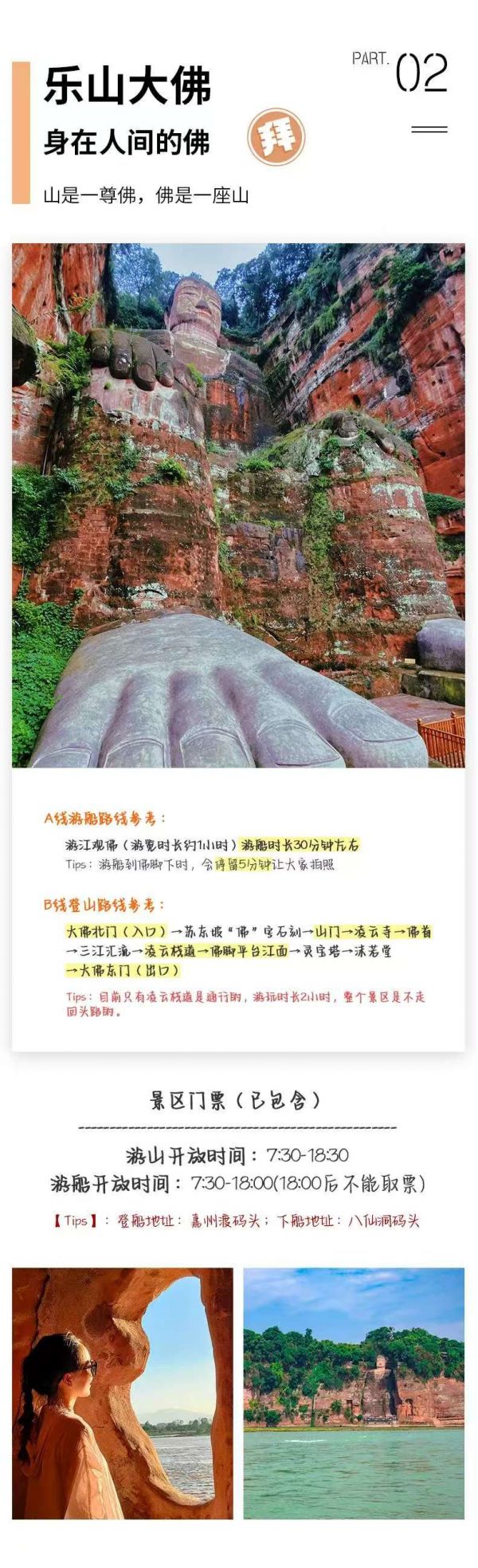 午餐后乘車前往【樂山大佛】景區(qū),(門票已含,游覽約 1.5-2 小時(shí))。觀賞世界第一大彌勒坐佛--樂山大佛、凌云寺、九曲摘道、大雄寶殿、靈寶塔,在瞻仰樂山大佛宏偉氣勢(shì)的同時(shí),體驗(yàn)”蜀道難、難于上青天的感覺”,抱千年佛腳后,游漫山的石刻佛像。